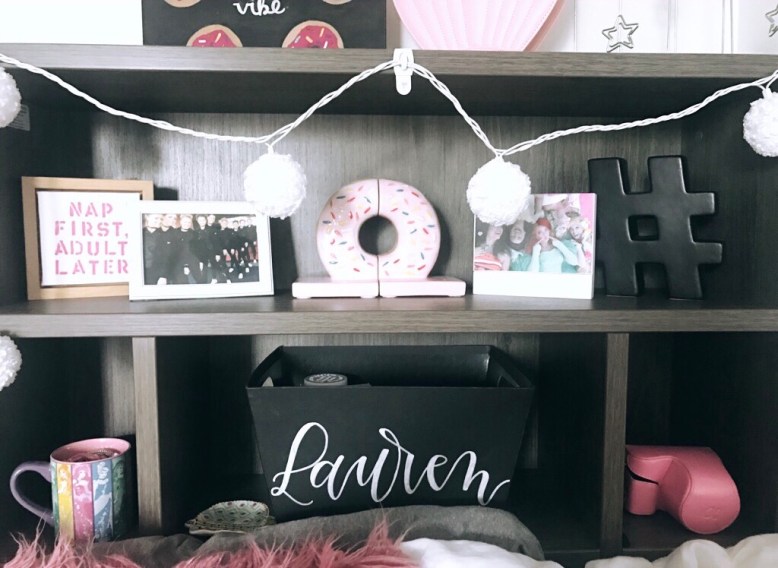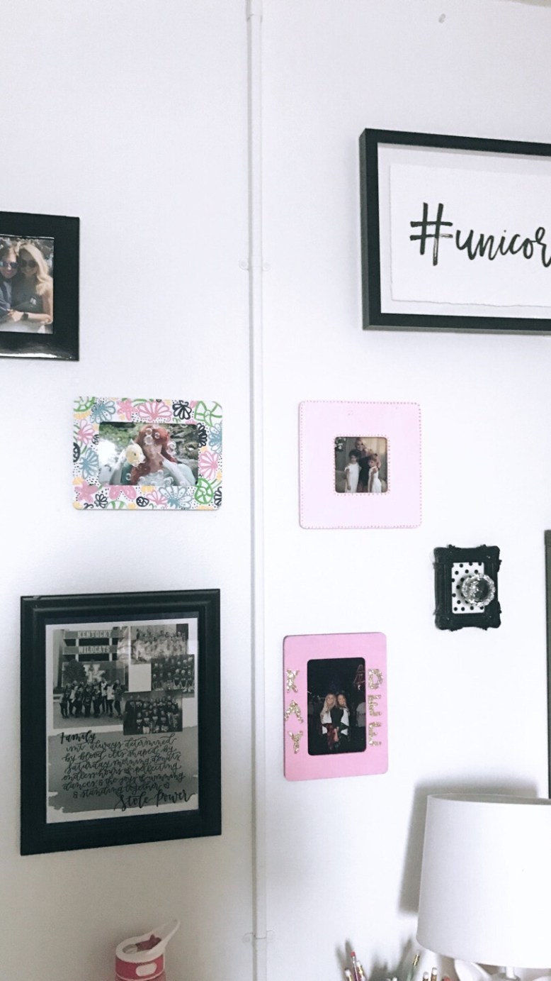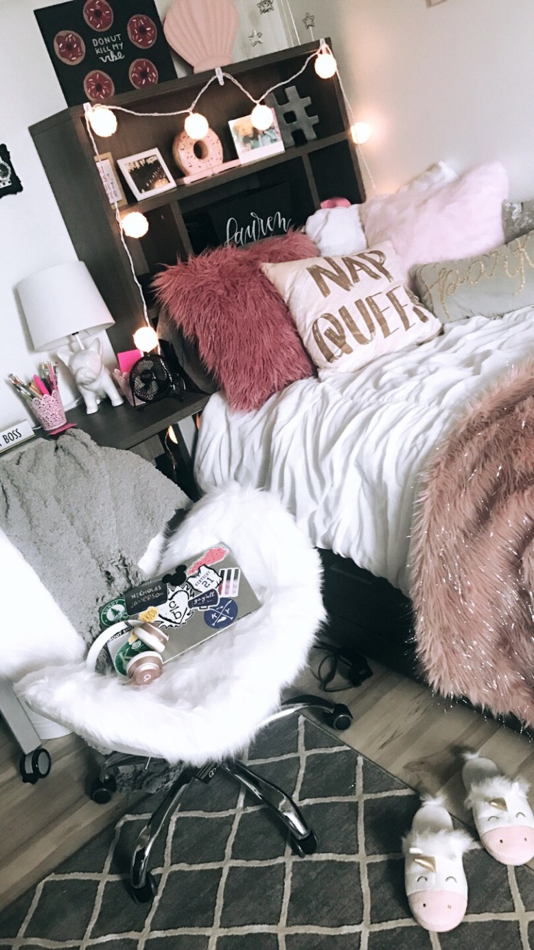 When picking out the decor for my new room at the Kappa Delta house a few things came to mind… the first thing being PINK. My Pinterest board “Roomspiration” is filled with pink, white, and grey tones. You can also find string lights, sparkle, and plenty of Disney touches. My room isn’t completed but it sure is close. I have a few more things to pick up but it’ll be perfect soon! I am so excited to be sharing it with you all so that you can have a glimpse into where all of my time is spent.